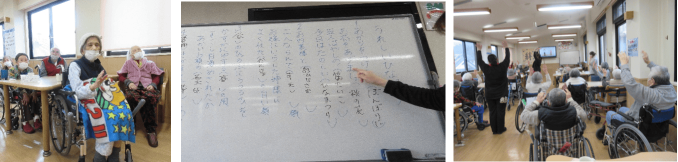 「ここに入る歌詞は何でしょう?」ひな祭りにちなんだレクリエーション開催中!頭を使って体を使って…今日も楽しい時間でした(*’▽‘)